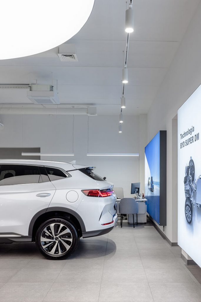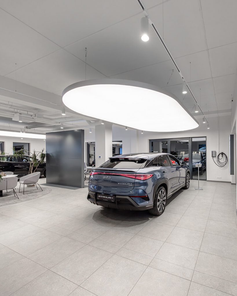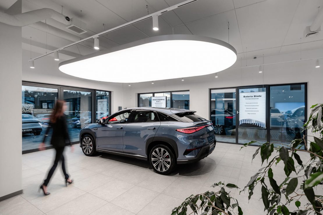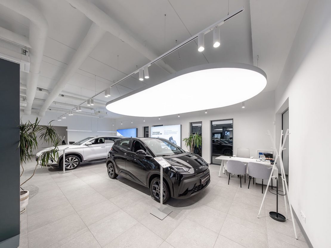 Das Beleuchtungskonzept des BYD Plichta Showrooms in Toruń wurde mit Fokus auf Funktionalität, hohe visuelle Qualität und ein herausragendes Kundenerlebnis entwickelt. Das helle, harmonische Interieur bildet den idealen Rahmen für die Fahrzeugpräsentation, wobei die Beleuchtung sowohl praktische als auch gestalterische Aufgaben erfüllt und Form, Details und Farben der ausgestellten Modelle betont. Alle eingesetzten Leuchten verfügen über eine minimalistische weiße Ausführung, die sich nahtlos in die Innenarchitektur einfügt, ohne deren Ästhetik zu stören. Es wurden sorgfältig ausgewählte, energieeffiziente LED-Leuchten verwendet, die ein ausgewogenes System schaffen, das Allgemeinbeleuchtung mit gezielten Akzenten auf wichtige Exponate kombiniert: