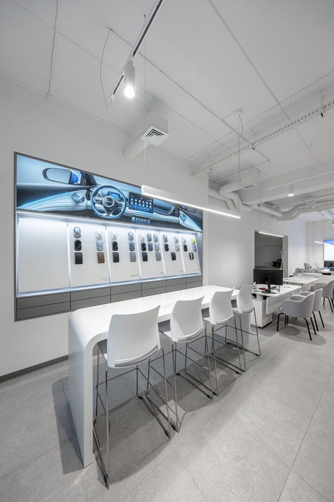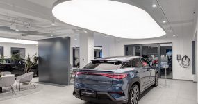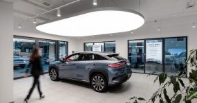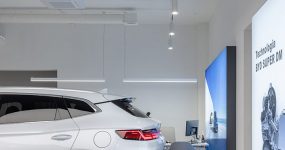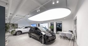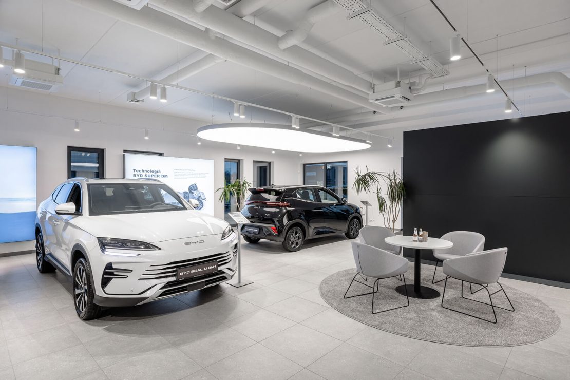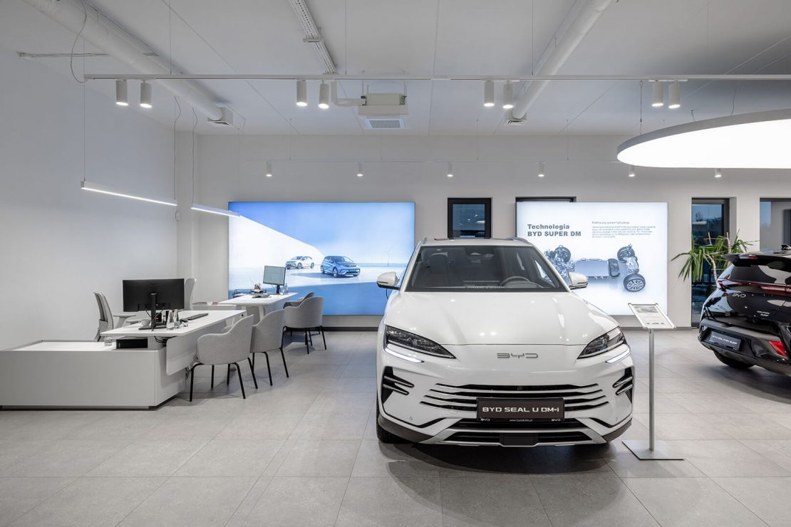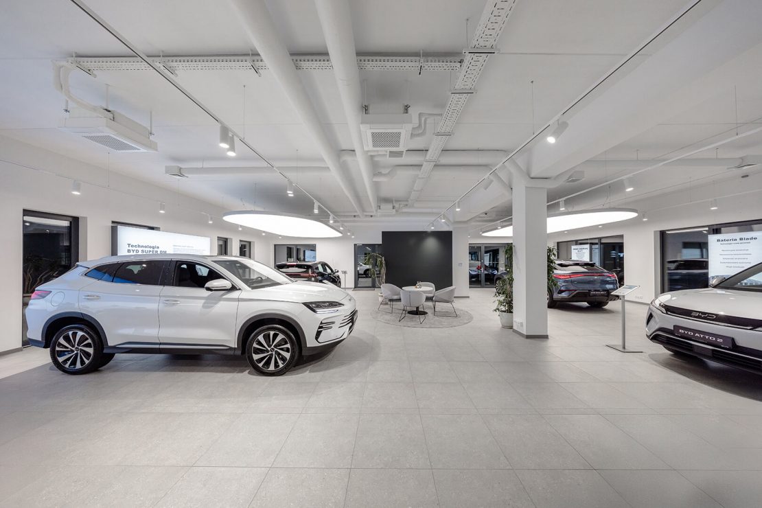 Das Beleuchtungskonzept des BYD Plichta Showrooms in Toruń wurde mit Fokus auf Funktionalität, hohe visuelle Qualität und ein herausragendes Kundenerlebnis entwickelt. Das helle, harmonische Interieur bildet den idealen Rahmen für die Fahrzeugpräsentation, wobei die Beleuchtung sowohl praktische als auch gestalterische Aufgaben erfüllt und Form, Details und Farben der ausgestellten Modelle betont. Alle eingesetzten Leuchten verfügen über eine minimalistische weiße Ausführung, die sich nahtlos in die Innenarchitektur einfügt, ohne deren Ästhetik zu stören. Es wurden sorgfältig ausgewählte, energieeffiziente LED-Leuchten verwendet, die ein ausgewogenes System schaffen, das Allgemeinbeleuchtung mit gezielten Akzenten auf wichtige Exponate kombiniert: