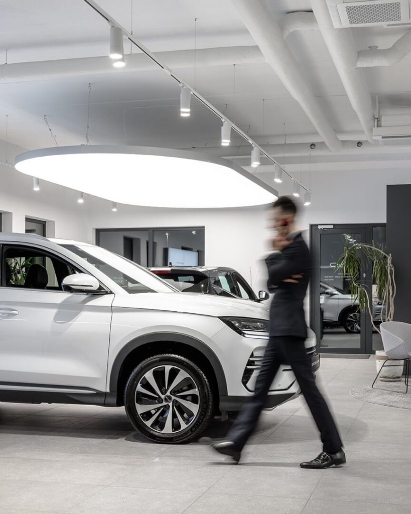 Dieses Beleuchtungssystem erfüllt die aktuellen Standards der Automobilbranche, in der die richtige Fahrzeugbeleuchtung die wahrgenommene Qualität erhöht, den Kundenkomfort unterstützt und die Effizienz der Präsentation steigert. Optimale Lichtintensität, hohe Farbwiedergabe und kontrollierte Akzentuierung wichtiger Elemente machen den Showroom attraktiv, komfortabel und kaufentscheidungsfördernd. Die eingesetzten Lösungen spiegeln die besten Praktiken bei der Beleuchtung von Autohäusern wider und verbinden Energieeffizienz, Ästhetik und Funktionalität.