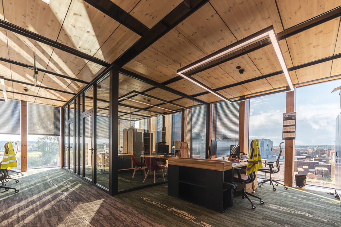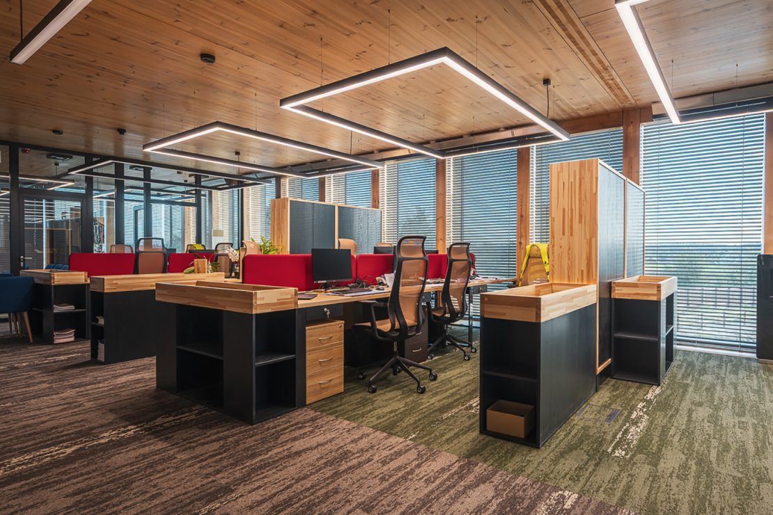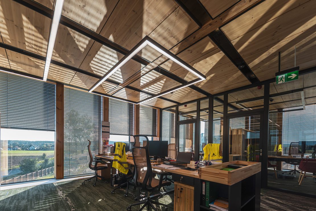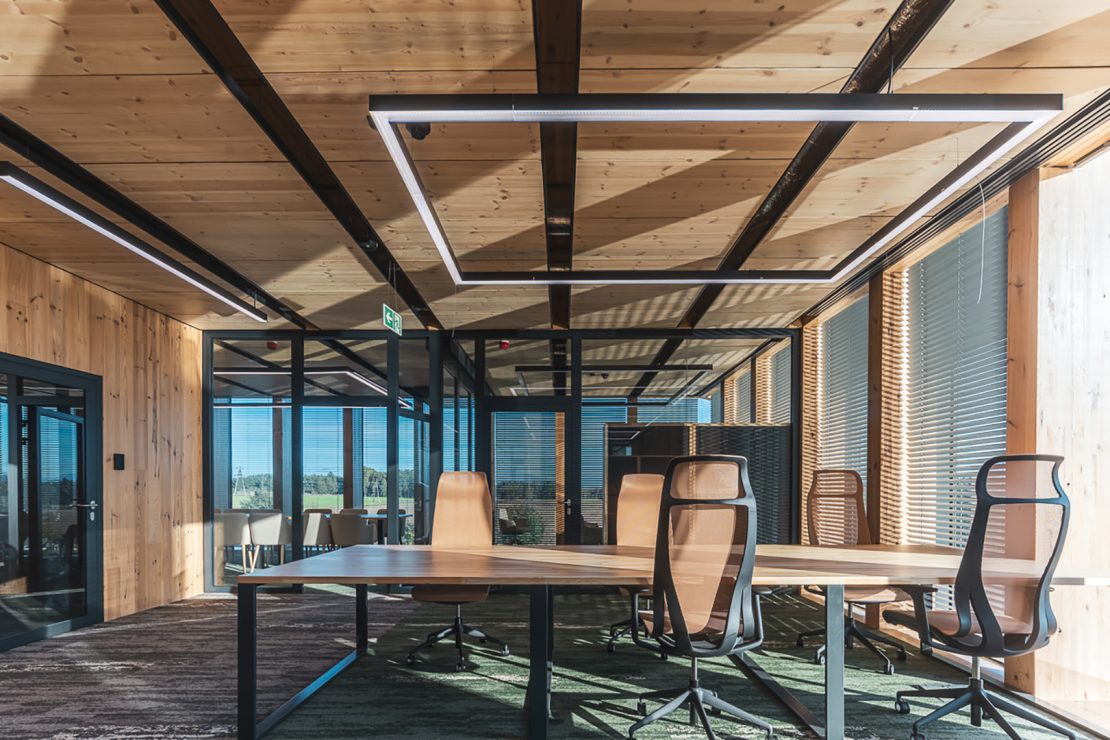The lighting concept, created with LUXIONA luminaires, perfectly complements the building’s distinctive character. X-Line LED luminaires in a system version and elegant black finish form striking geometric compositions and long, continuous lines running through the office interiors. Additional accents are created by X-Wall and Artshape luminaires — Six, Three, Square, and X — adding rhythm, balance, and a refined aesthetic to the natural warmth of the wooden space.