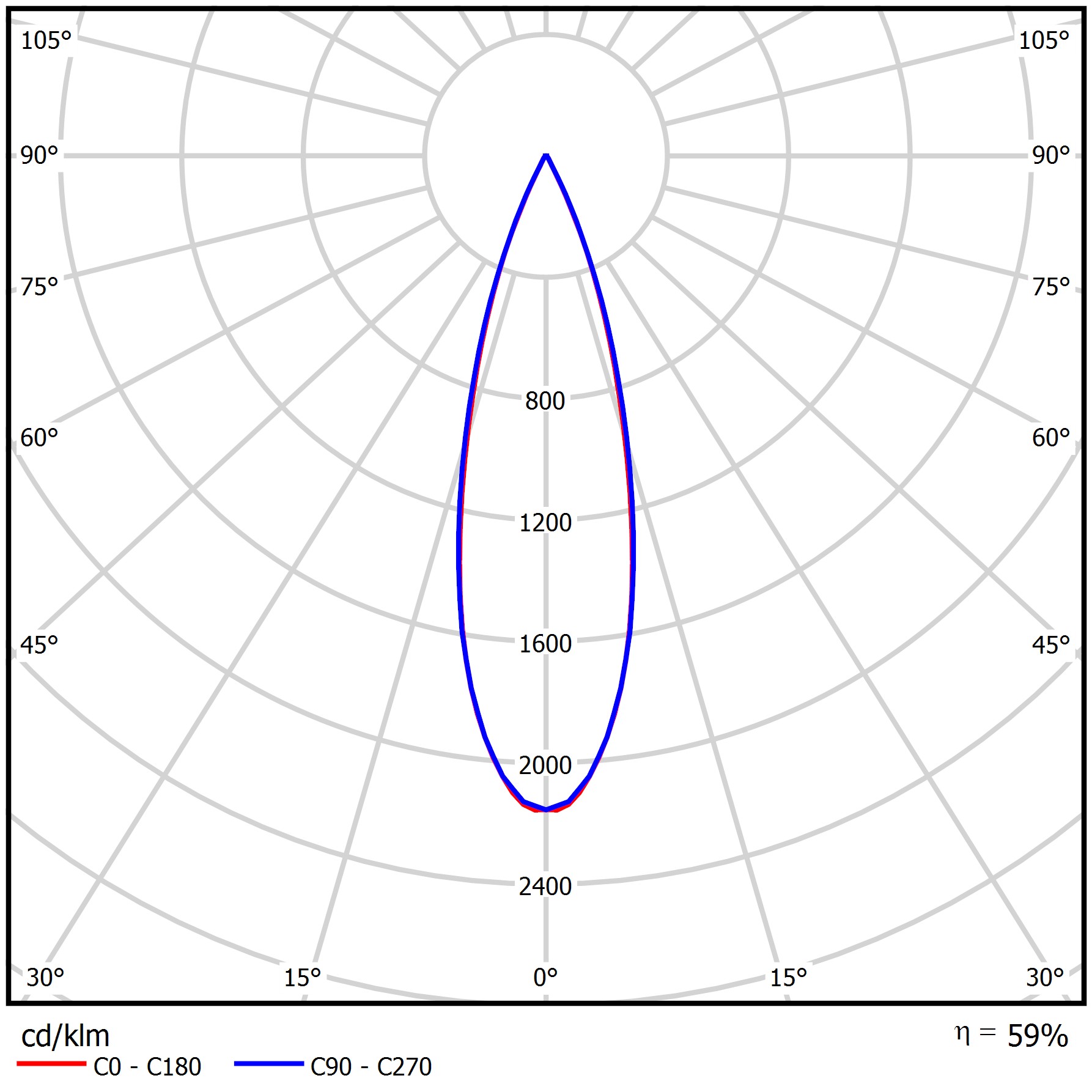 | Kąt rozsyłu światła [°] | (C0-C180) / (C90-C270) - 29° / 29,8° |