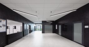 Przestrzenie wspólne oświetlają estetyczne i energooszczędne linie X-LINE SLIM, UNIVERSAL LINE LED oraz BERYL NEW LED O, które podkreślają charakter budynku i tworzą komfortową atmosferę.